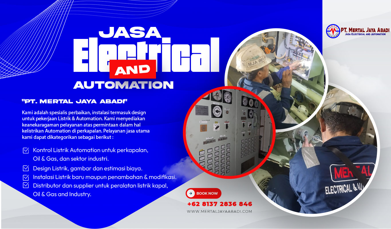 PT. MERTAL JAYA ABADI berdiri sejak tahun 2016 di Batam. Perusahaan ini adalah spesialis perbaikan, instalasi termasuk design untuk pekerjaan Listrik & Automation. Kami menyediakan keanekaragaman pelayanan atas permintaan dalam hal kelistrikan Automation di perkapalan. Semua staff ahli kami dari Universitas dan berpengalaman lebih dari 19 tahun dalam kelistrikan kapal maupun industri. Dan siap bekerja sama untuk kepuasan pelanggan. Kami tidak hanya sekedar menjual jasa tetapi lebih dari pemecahan masalah dan men-support secara tehnikal terschedule dan tepat waktu untuk pelanggan kami.